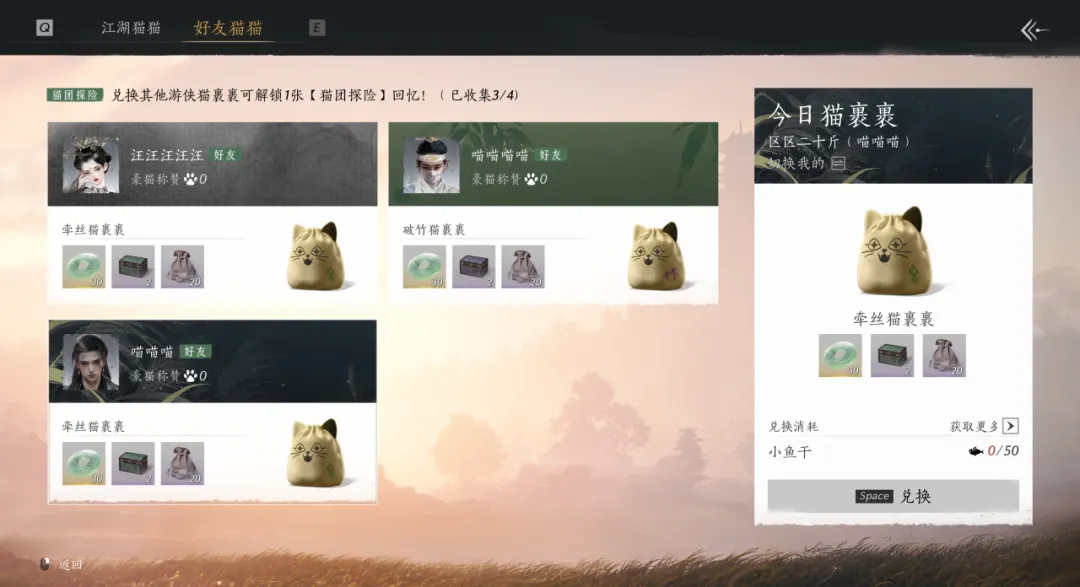 游侠若从江湖好友的寻宝小猫处兑换「猫裹裹」,还将额外解锁一张「猫团探险」回忆画册,记录下小猫们江湖同行的瞬间,见见喵的“狐朋狗友”,并获得额外的【长鸣玉】奖励。通过妙六一八相识的游侠们也未尝不能从萍水相逢化为知心好友!